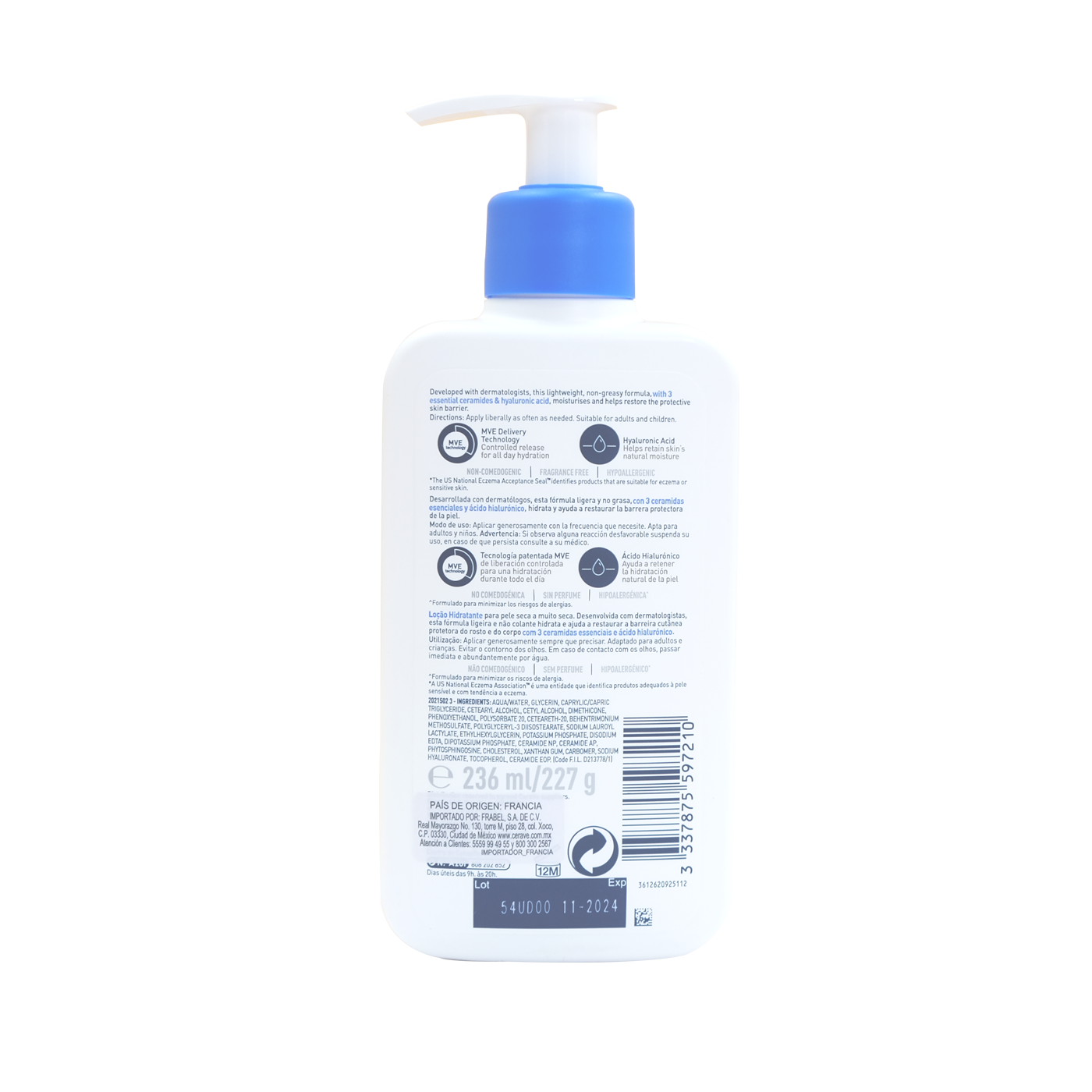 La loción hidratante mantiene la piel del rostro y cuerpo hidratada por 24h, además, de ayudar a restaurar la barrera protectora de la piel. Fórmula ligera.